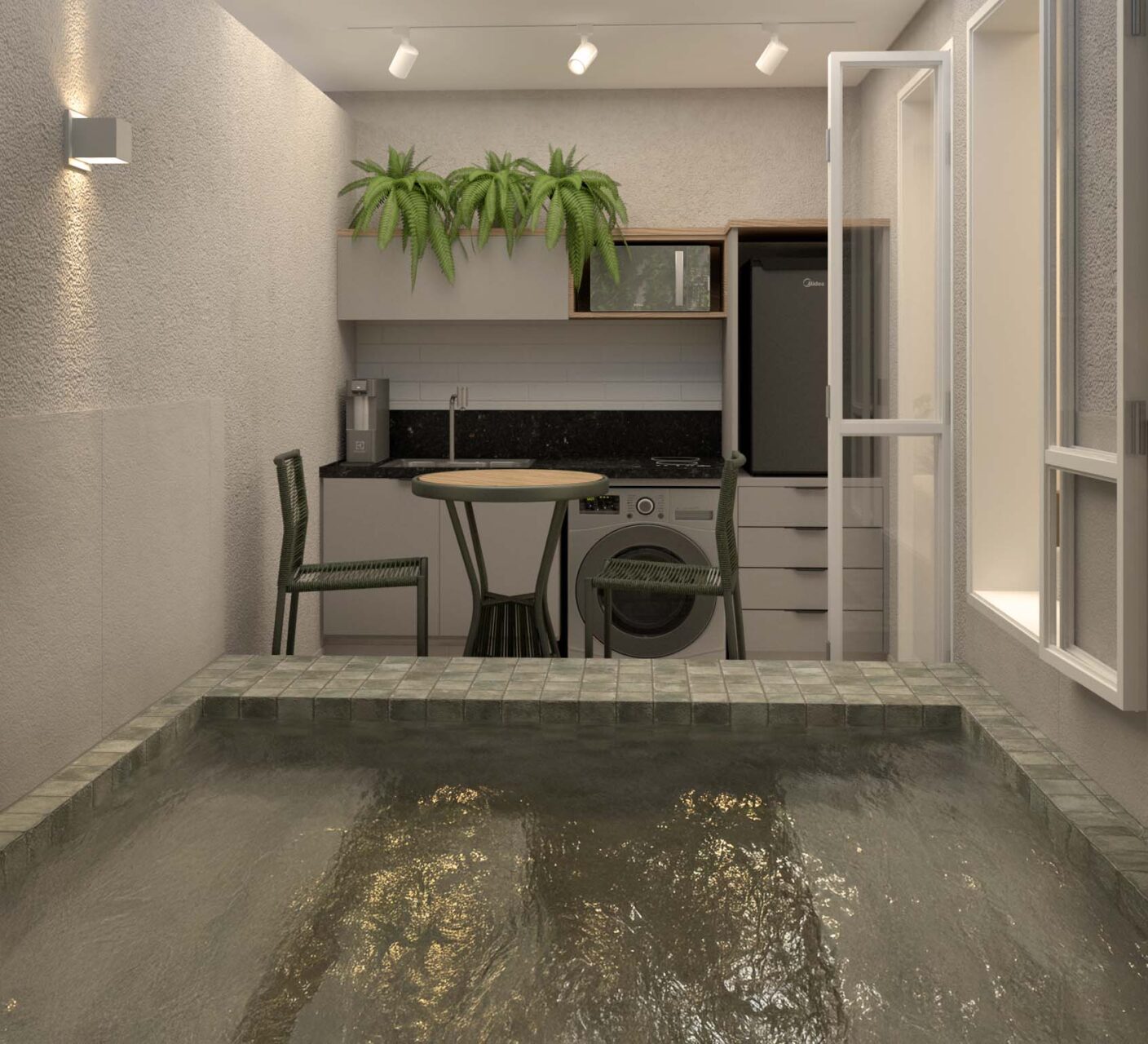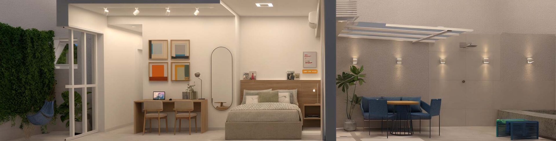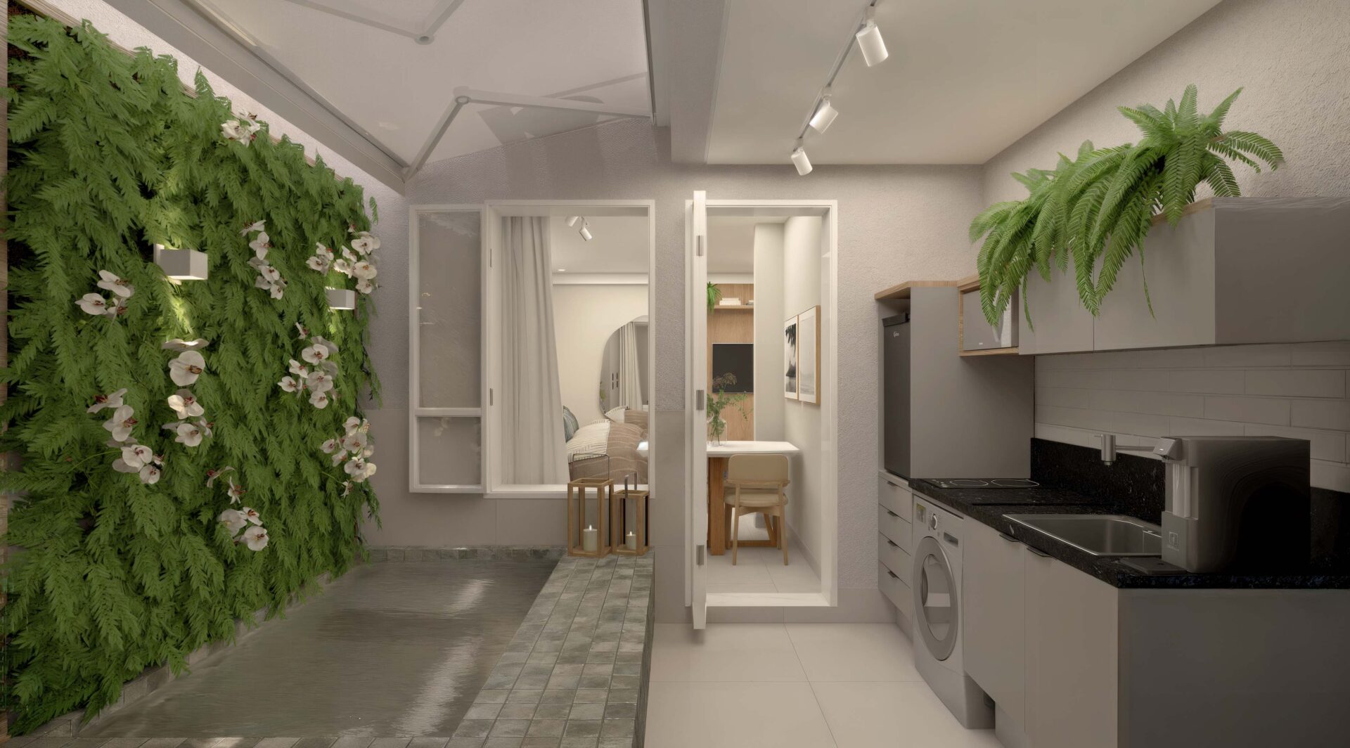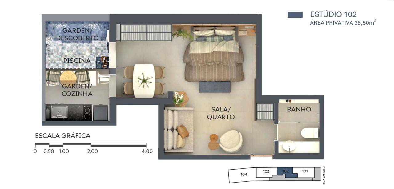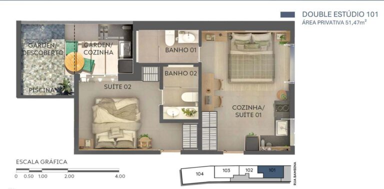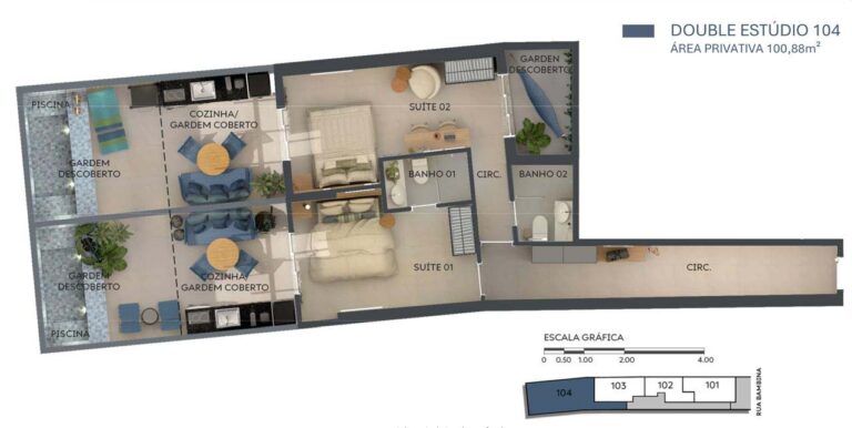 – Gardens com Piscina: algumas unidades no térreo contam com jardins privativos e piscina (Double Studio de 51,47m², o Studio de 38,50m², o Sala/Quarto de 49,00m² e o Double Studio de 100,88m²)