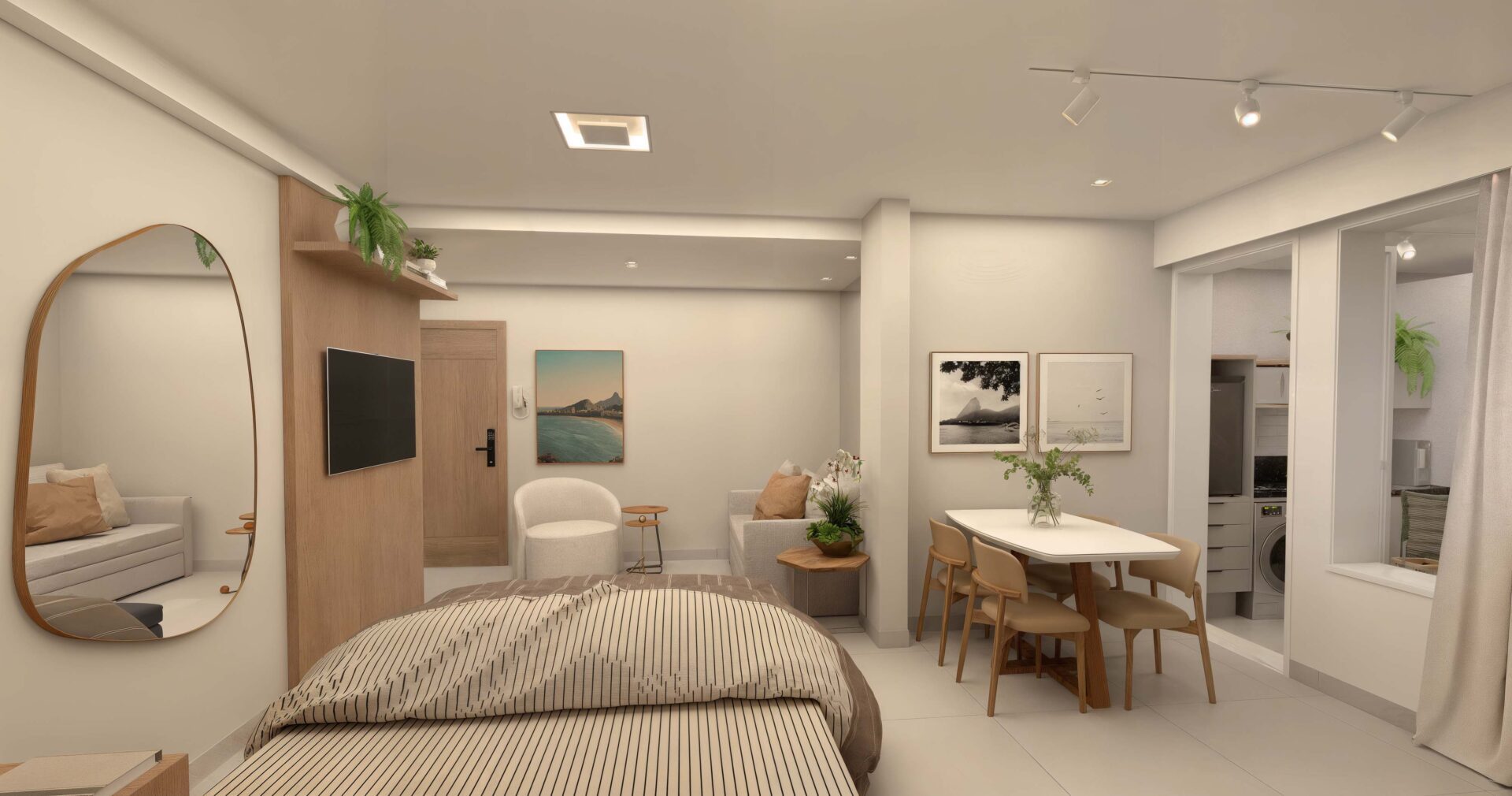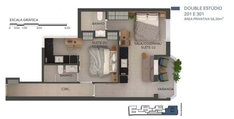 – Studios e Double Studios: metragens de 38,50m² (Studio) e 51,47m², 100,88m² ou 59,30m² (Double Studio)