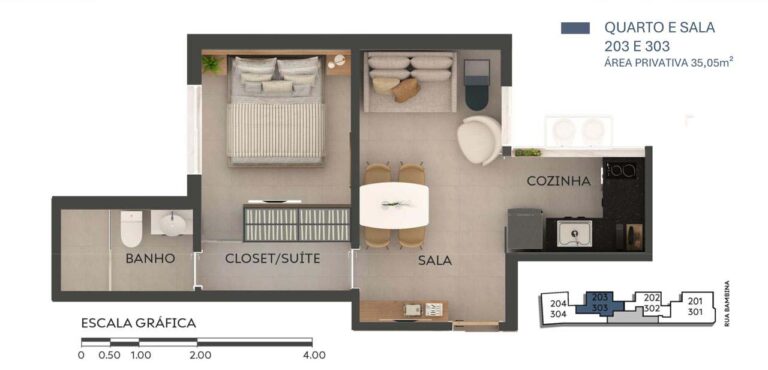 – Unidades Sala/Quarto: áreas de 49,00m², 33,75m² ou 35,05m²