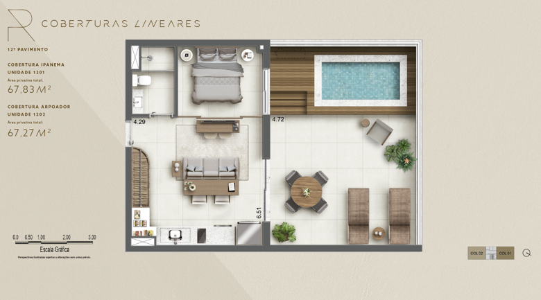 Escolha entre metragens que variam de 36m² a 81m², com opções de 1 ou 2 banheiros, adaptando-se perfeitamente ao seu estilo de vida. Desfrute da exclusividade de viver em Ipanema, em um projeto pensado para você.